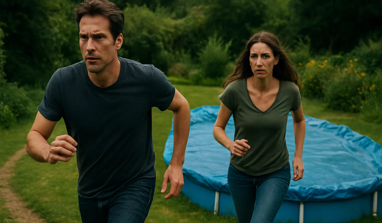 Une poursuite insolite: fuite, jardins et bâche de piscine